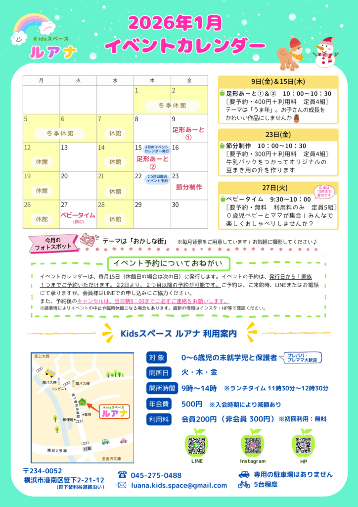 ◆1月のイベント予約は、カレンダー発行日から1家族1つまで承ります。12月22日より2つ目以降の予約が可能です。