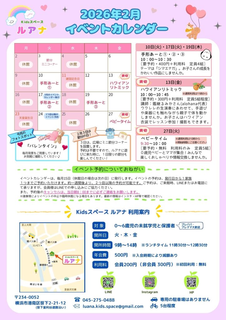 ◆2月のイベント予約は、カレンダー発行日から1家族1つまで承ります。1月22日より2つ目以降の予約が可能です。